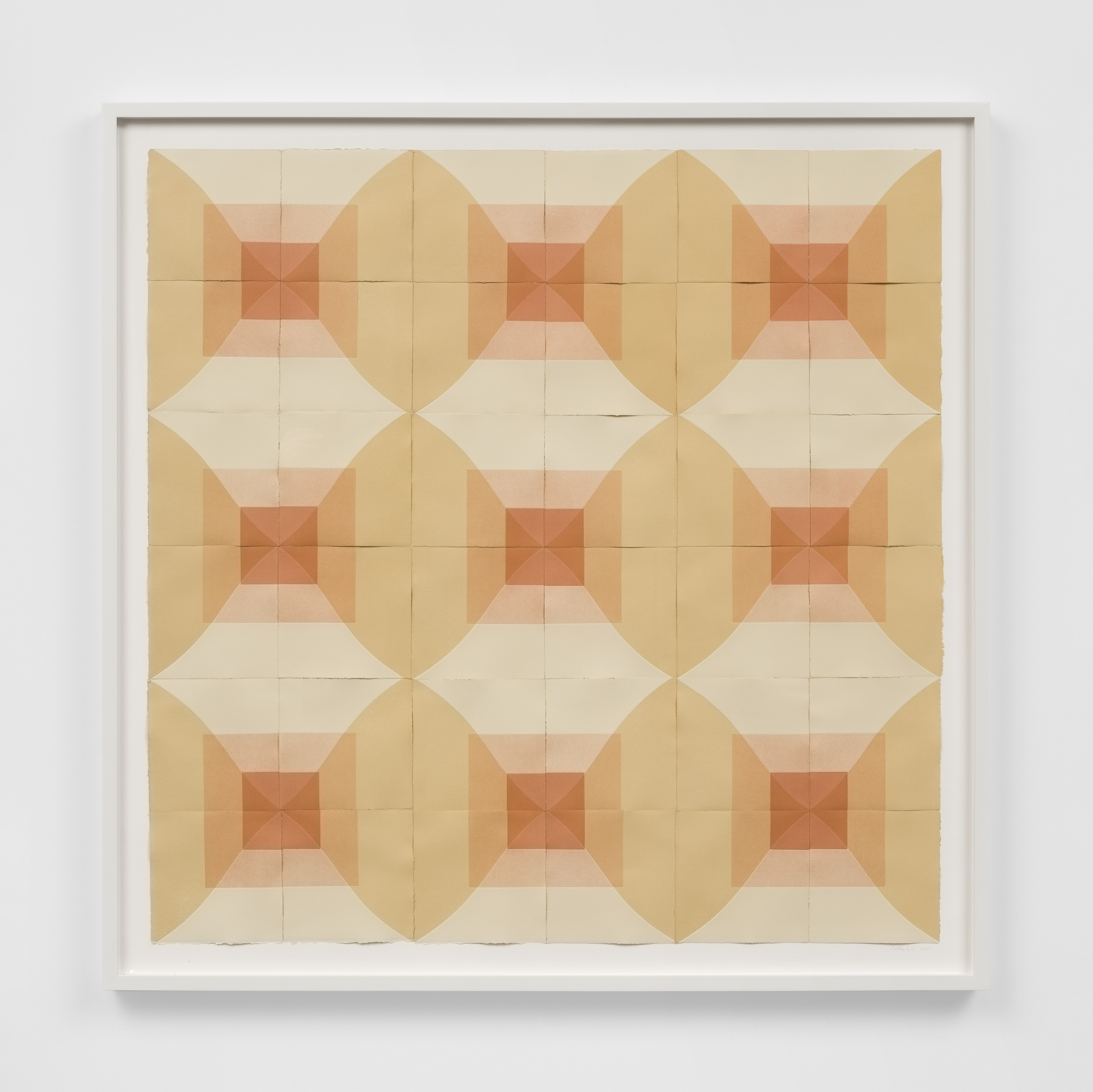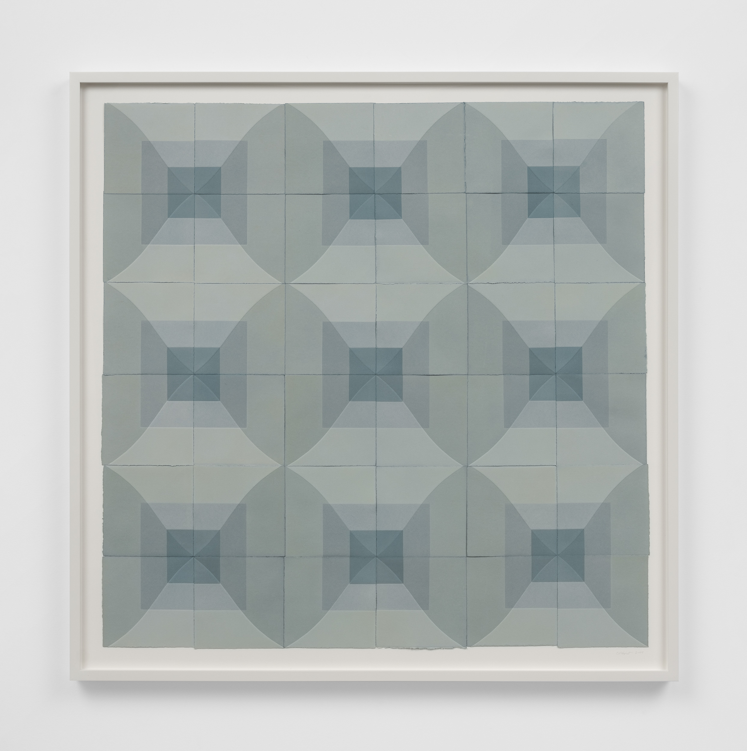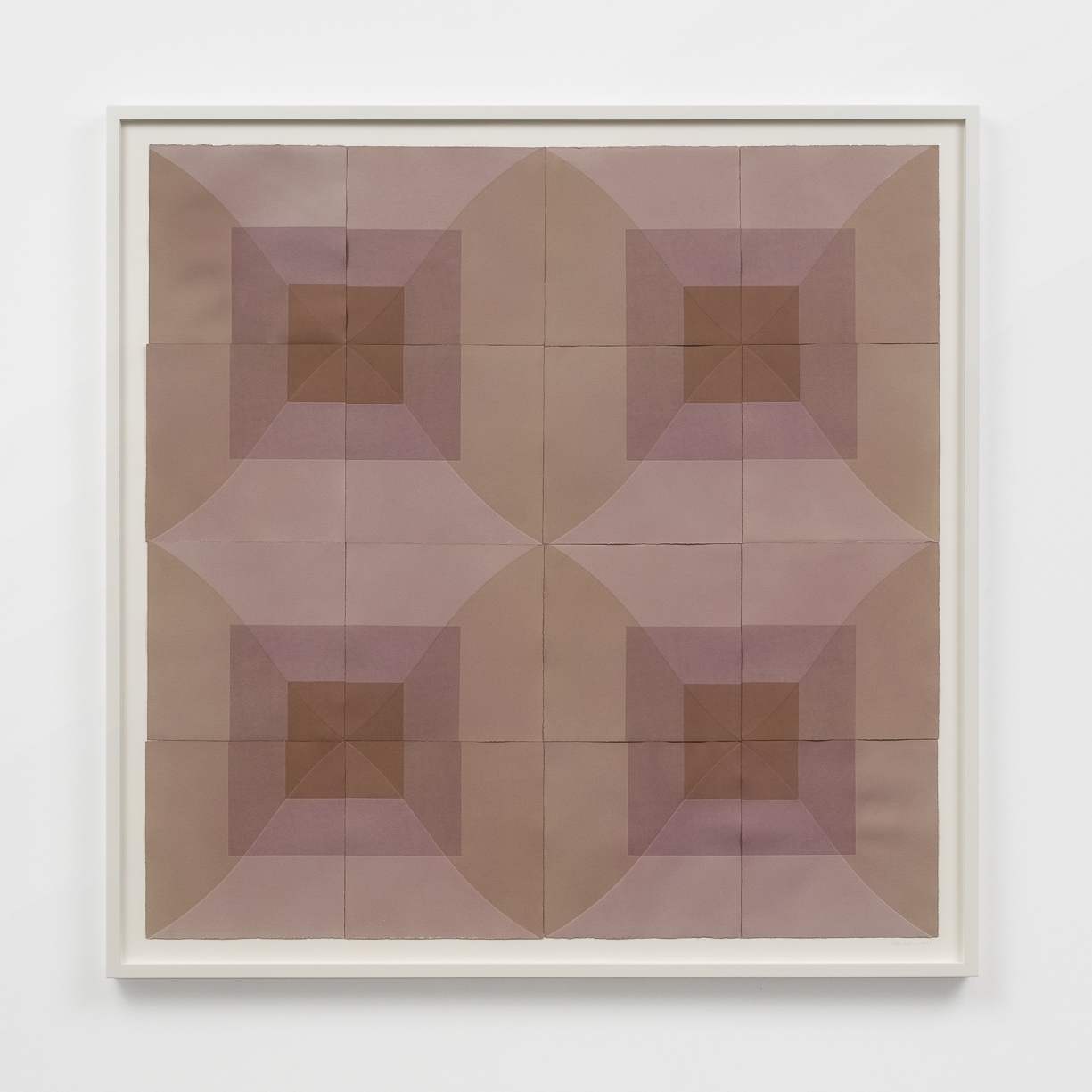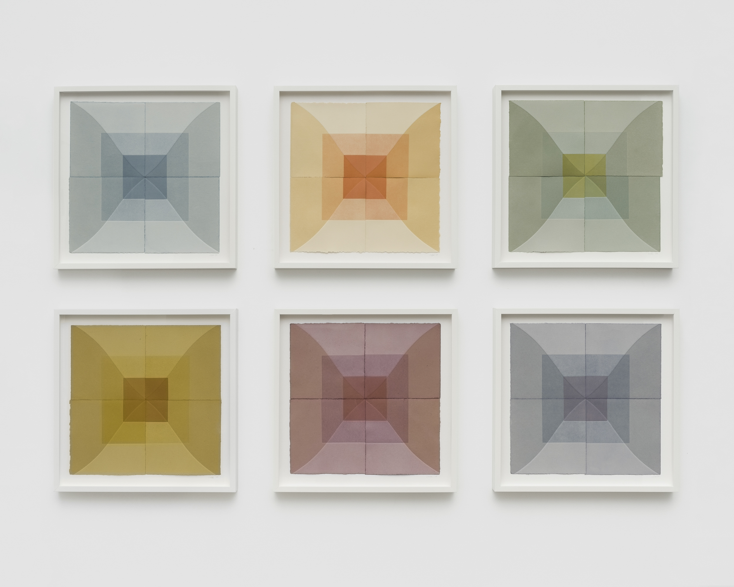 Humphreys gravitates towards a meditative range of color: the prints she pulls are nuanced monochromes of soft violets, greens, ochres, earthy blues or terracotta. In New Blue Son, symmetrically arranged squares and diamonds alternate across a grid to form a kaleidoscopic pattern. The artist often presents her editions together, positioned edge to edge like tiles, so that their tessellated fragments cohere into one whole, softly geometric, color field composition. A varying depth of field is created in the way Humphreys layers ink over dye, forming dark squares that anchor her compositions as distinguishing lines and paper edges radiate outward.