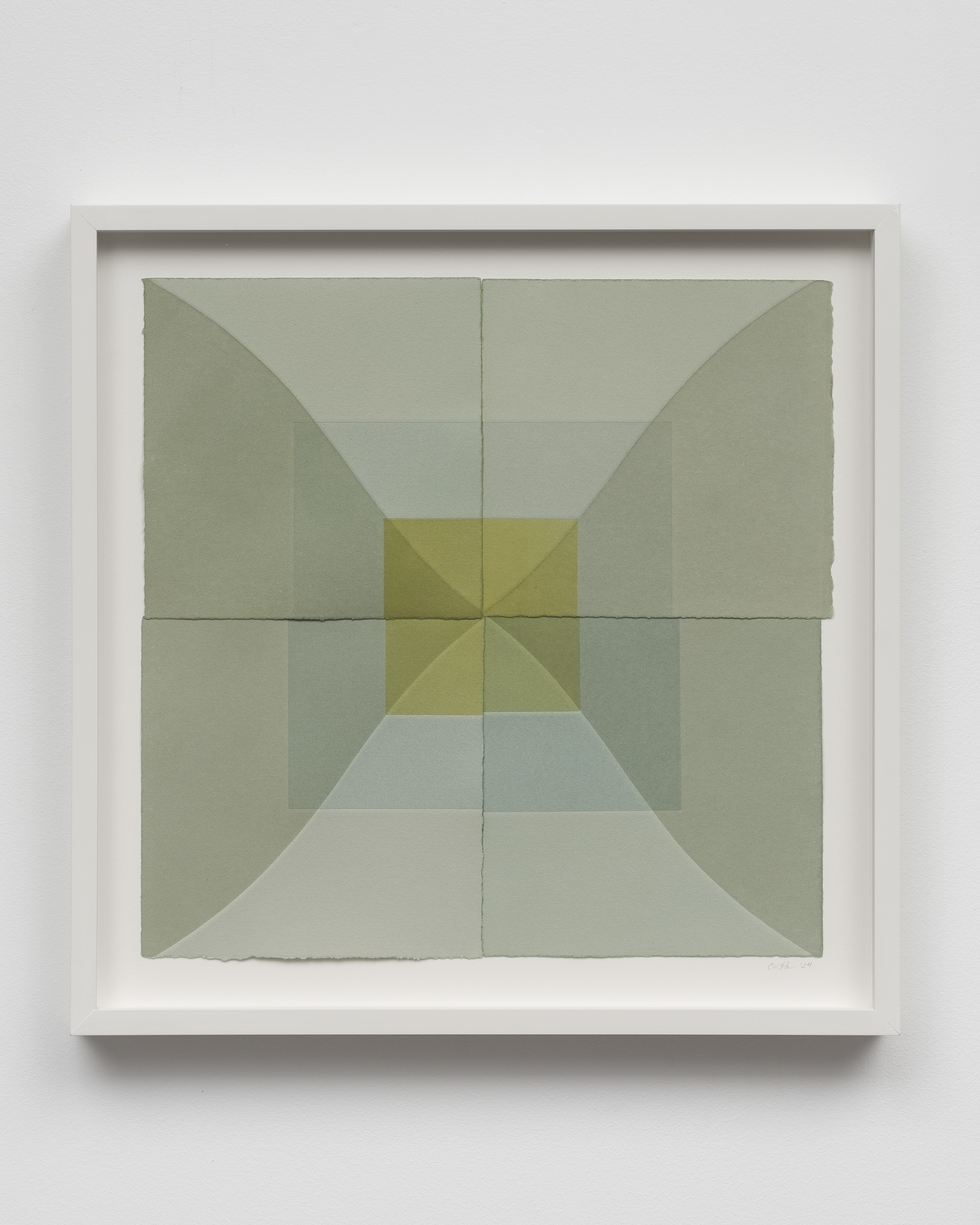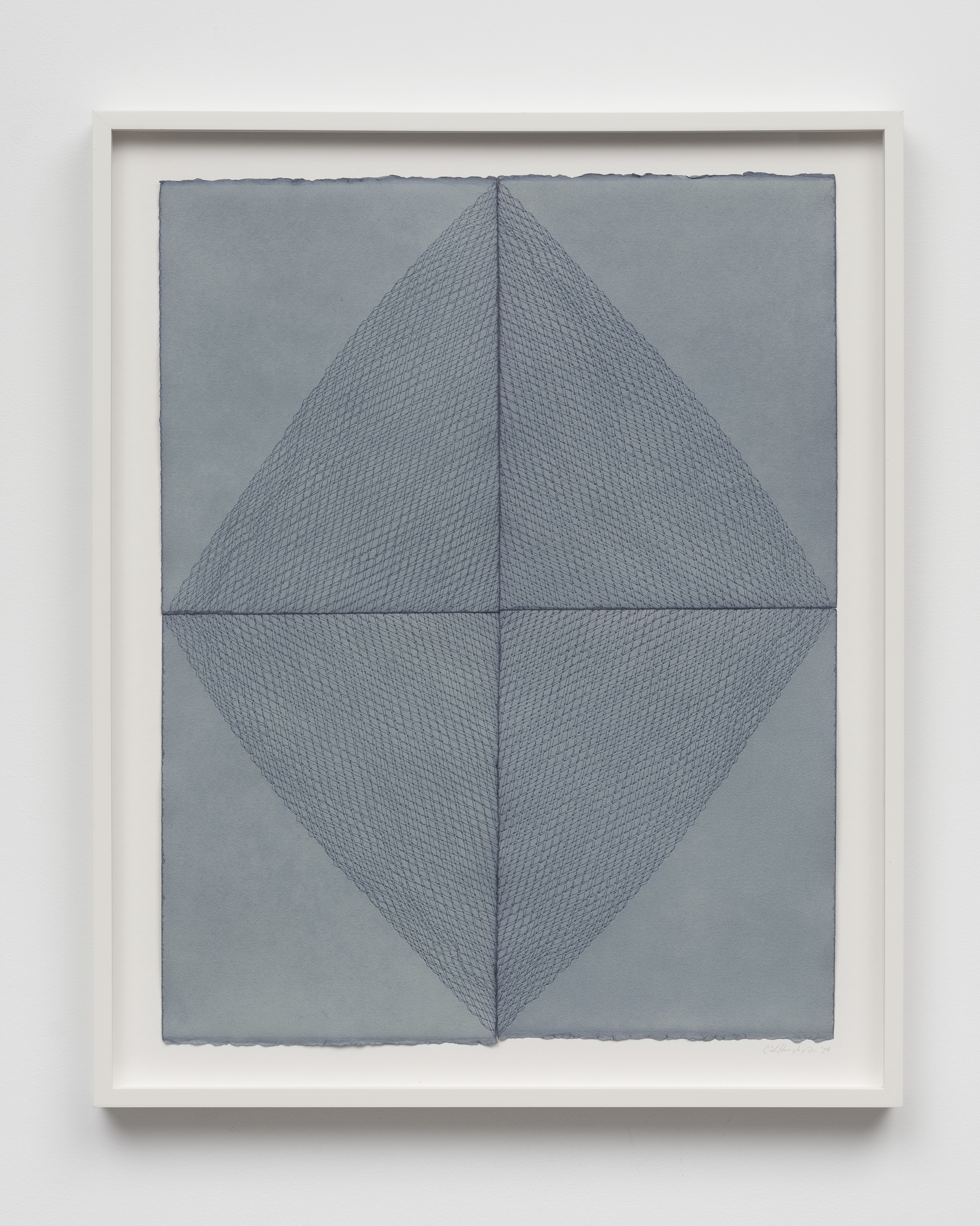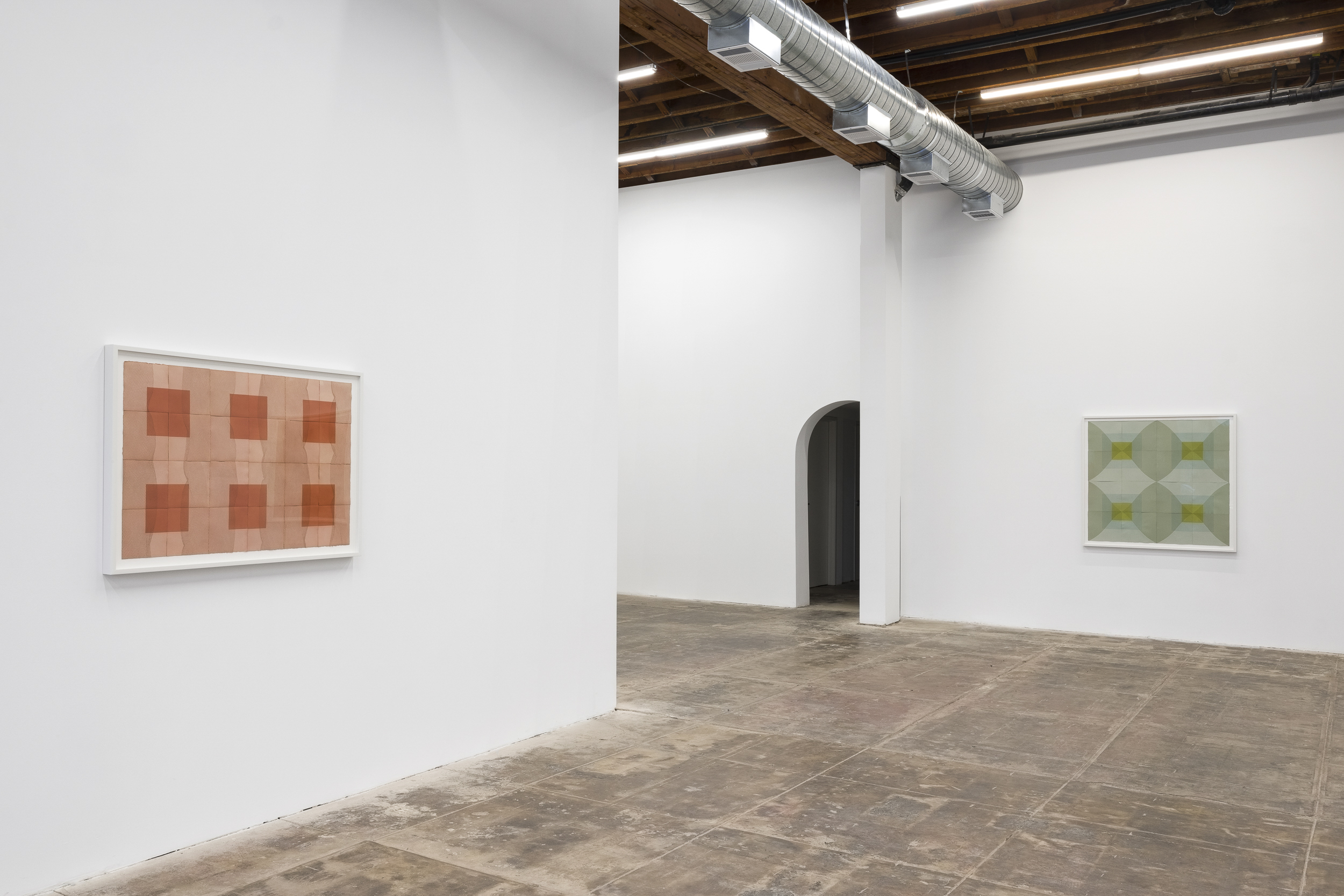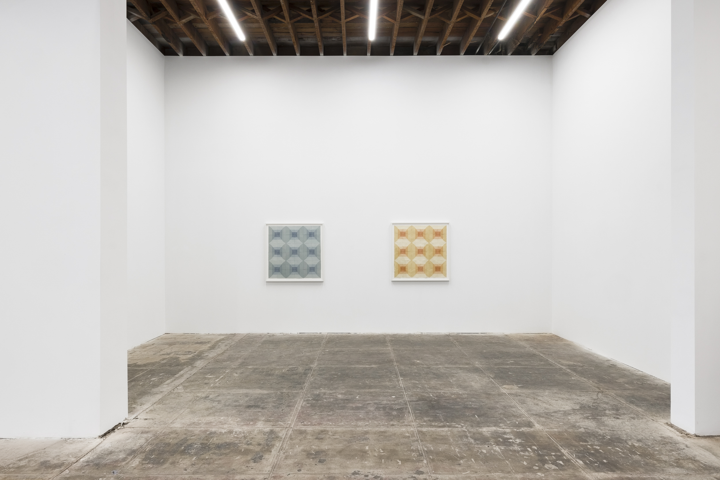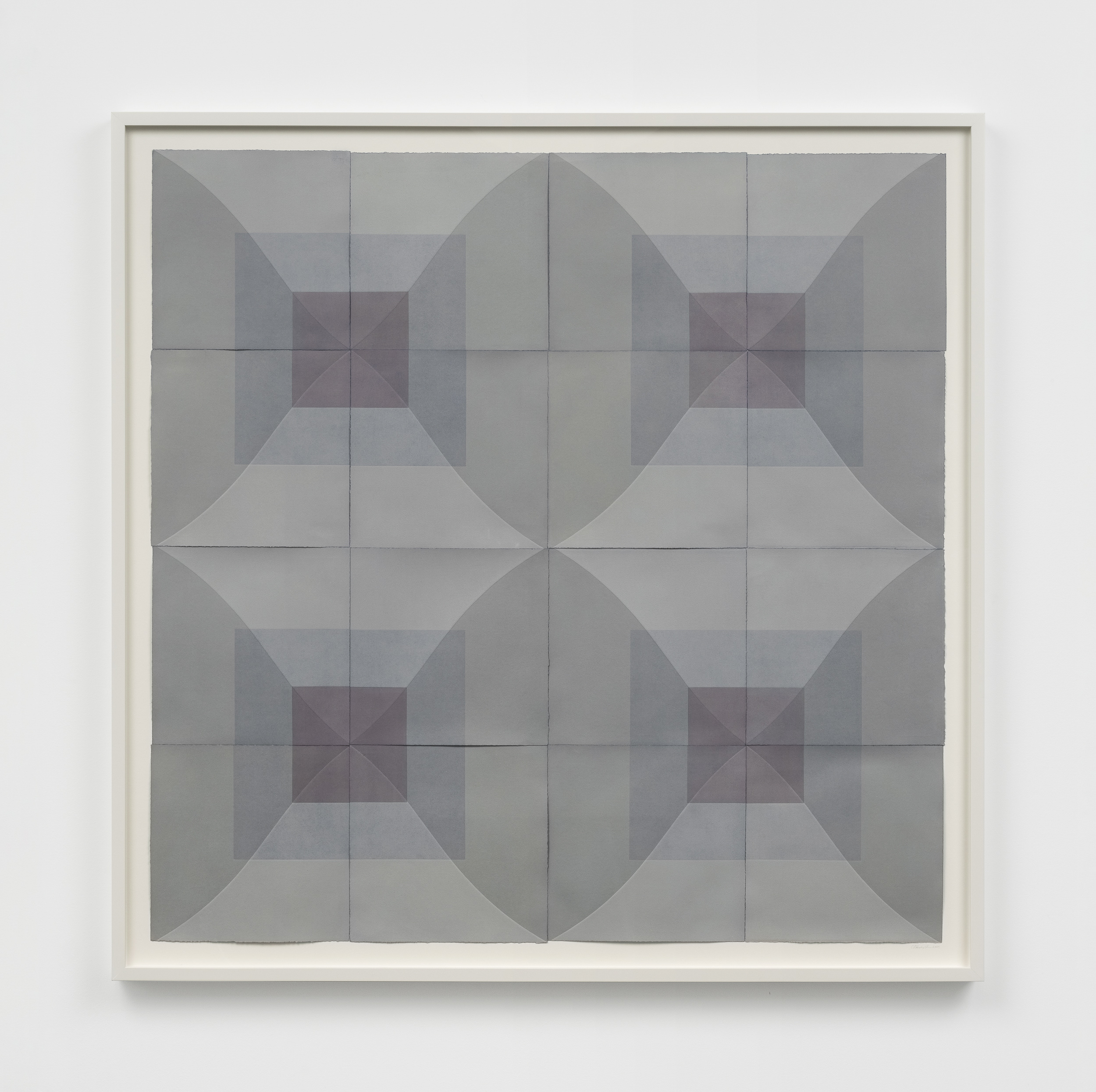 Humphreys gravitates towards a meditative range of color: the prints she pulls are nuanced monochromes of soft violets, greens, ochres, earthy blues or terracotta. In New Blue Son, symmetrically arranged squares and diamonds alternate across a grid to form a kaleidoscopic pattern. The artist often presents her editions together, positioned edge to edge like tiles, so that their tessellated fragments cohere into one whole, softly geometric, color field composition. A varying depth of field is created in the way Humphreys layers ink over dye, forming dark squares that anchor her compositions as distinguishing lines and paper edges radiate outward.