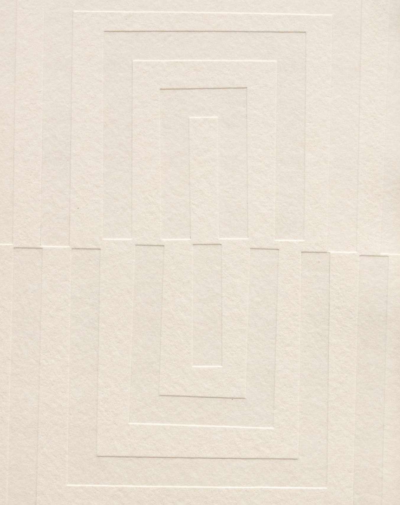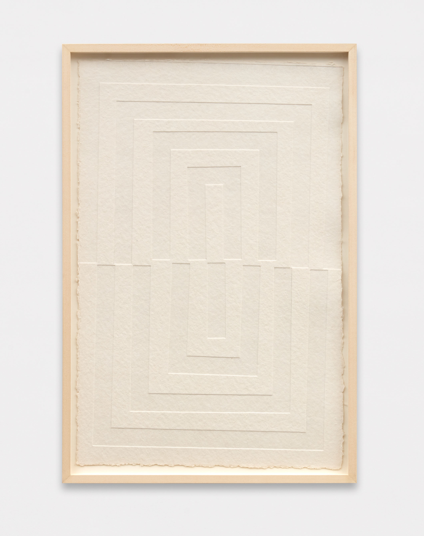 Humphreys’ practice is organized not just around arrival at finished form, but rather in the physical performance of making and deciding and remaking and deciding and editing. Dyeing and printing processes often exert sequential pressures on the artist, who must prepare her support papers for hours in advance to enable them to absorb natural pigments such as indigo and avocado, then expose them to these pigments for hours, then, in this case years later for some fragments, on to the processes of embossing, inking and assembling anew.